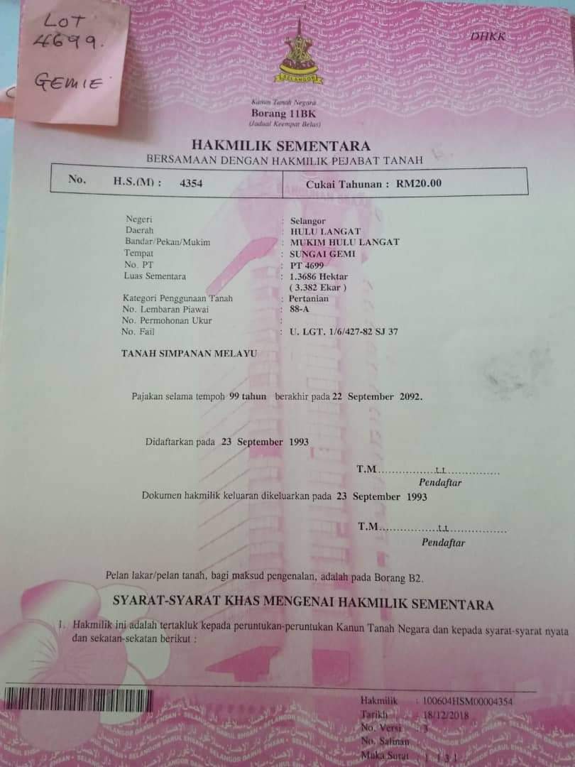 Sungai Lui Mukim Hulu Langat Status tanah :